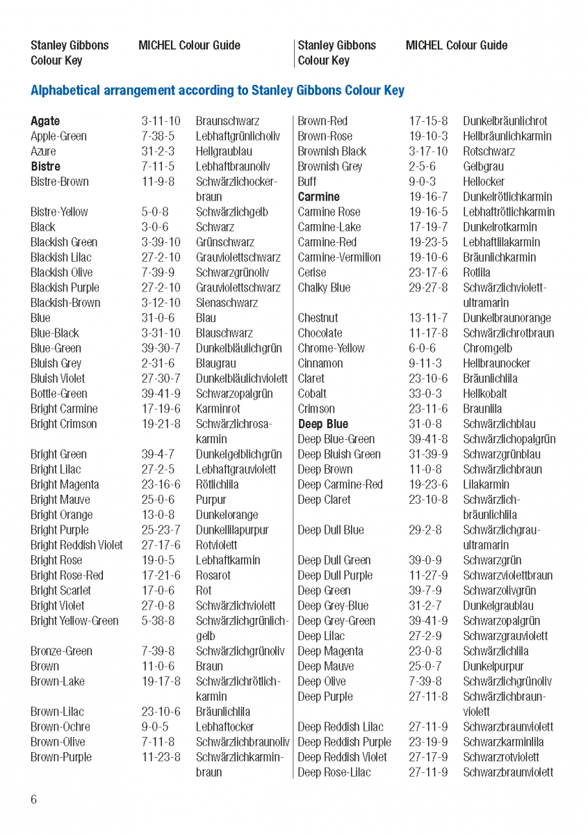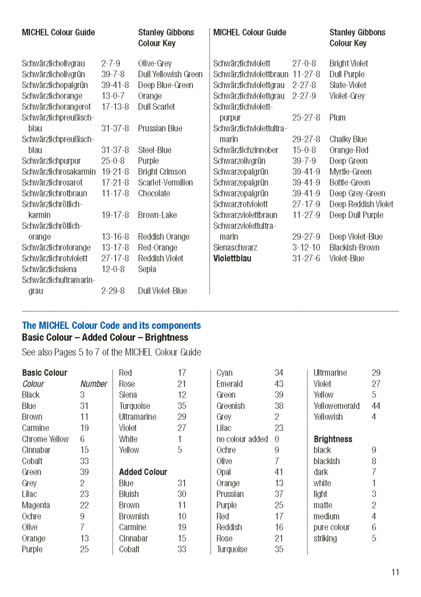 Inhalt: Ergänzung zum MICHEL Farbenführer auf Deutsch und Englisch mit Abgleich der Farbbezeichnungen von Stanley Gibbons.
