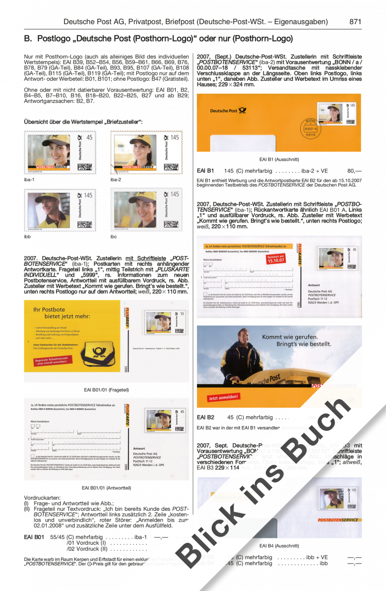 Bei den Eigenausgaben mit amtlichen Wertstempeln ist die Katalogisierung ab 2021, mit Privatpost-Wertstempeln „Deutsche Post“ ab 2020 fortgeführt. Ab Oktober 2022 ändert sich die Form der individuellen Deutsche-Post-Wertstempel, mit Verwendung des vergrößerten und bei jeder Ganzsache unterschiedlichen Matrixcodes. Eine Erläuterung hierzu findet sich in der erweiterten Einführung auf S. 850. Nach dem Wegfall der Frankierung von Dialogpost mit Wertzeichen, stellen die nachfolgenden, anstelle eines Wertstempels nur mehr ein Bildmotiv aufweisenden Aussendungen keine Ganzsachen dar, eine Katalogisierung derartiger Stücke erfolgt nicht.