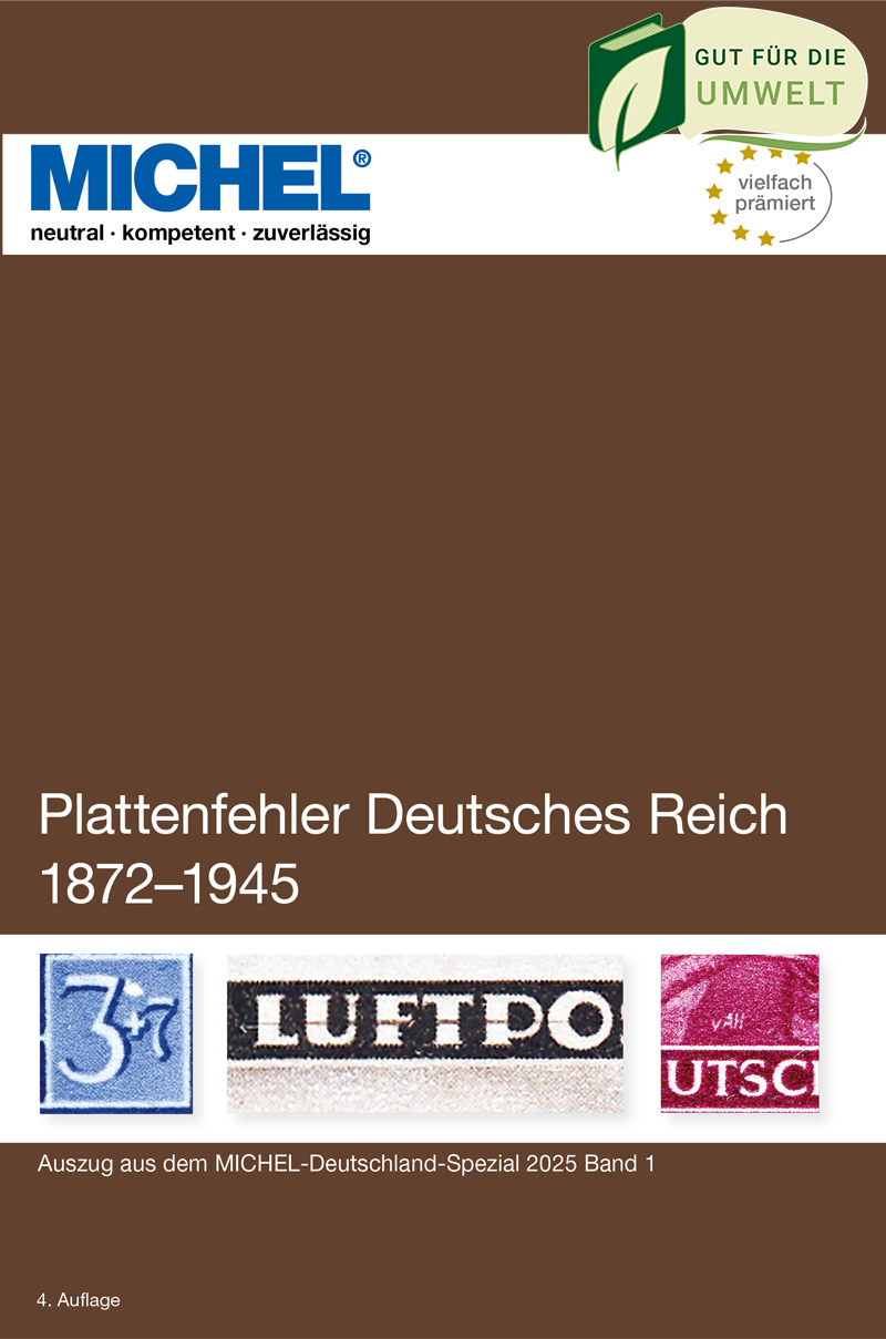 Das MICHEL-Handbuch „Plattenfehler Deutsches Reich 1872–1945“, ein Auszug aus dem MICHEL-Deutschland-Spezial 2025 Band 1, hilft dabei, da hier in kompakter Form die grundlegenden Briefmarkenbeschreibungen und die bisher bekannten Plattenfehler zusammengefasst sind.