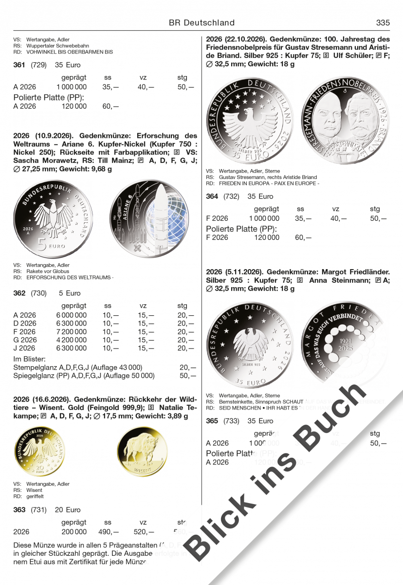 Soweit bekanntgegeben, wurden die Prägezahlen der Eurokursmünzen ergänzt und die Aus-gaben des Jahres 2026 eingearbeitet. Der Katalog enthält für die deutschen Münzen auch eine Vorschau auf die geplanten Ausgaben des Jahres 2026 und das Ausgabeprogramm für 2027. Neu aufgenommen in den Katalog wurden die Euro-Kursmünzen Bulgariens, die es seit 2026 gibt.