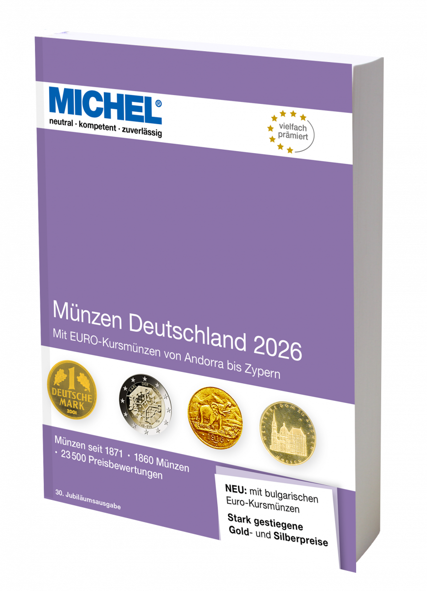 Für die Sammler der 2-Euro-Kursgedenkmünzen wurden wieder die Neuheiten des Jahres 2025 aller teilnehmenden Euroländer mit entsprechenden Auflagen und Preisen erfasst. Damit ist der MICHEL ein inzwischen unverzichtbares Nachschlagewerk für die Sammler dieses Gebietes geworden. Die Tendenz des Münzenmarktes, für qualitativ überdurchschnittlich erhaltene Münzen, entsprechend hohe Preise zu zahlen, hat sich weiter fortgesetzt. Die aktuelle Entwicklung des Gold- und Silberpreises ist in der vorliegenden Katalogauflage bei der Preisfindung entsprechend berücksichtigt worden. Dabei wurde ein Goldpreis von 125 Euro und ein Silberpreis von 2 Euro je Gramm fein für Mitte Januar 2026 angesetzt. Die schnelle Preisentwicklung für Gold und Silber wird zu weiteren Preisänderungen führen.