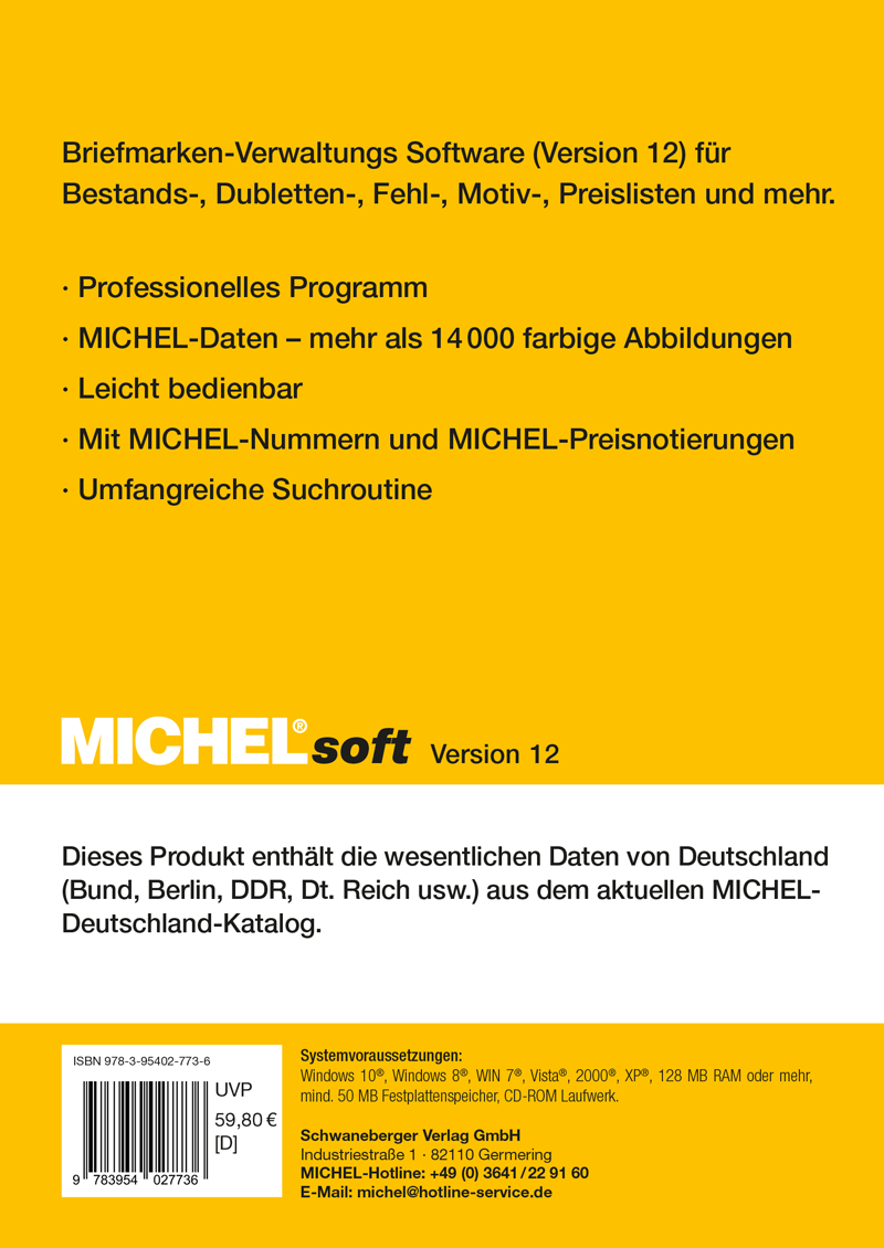 Inhalt:Das Software-Paket zur digitalen Verwaltung von Briefmarken enthält die Programmversion 12, die aktuellen Daten des MICHEL-Deutschland 2022/2023 (Bund, Berlin, DDR, Dt. Reich usw.) und über 14.000 farbige Abbildungen.