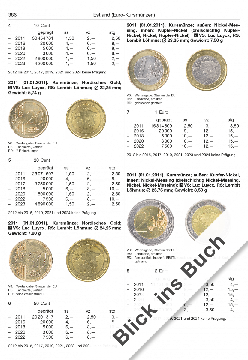 Content:German coins starting in 1871 (German states, German Reich, emergency coins, Ger-man colonies, occupied territories World Wars I and II, Gdansk, German Democratic Republic, Saarland, Federal Republic of Germany), Euro currency coins and commem-orative 2-Euro coins (Andorra, Austria, Belgium, Croatia, Cyprus, Estonia, Finland, France, Greece, Ireland, Italy, Latvia, Lithuania, Luxembourg, Malta, Monaco, Nether-lands, Portugal, San Marino, Slovakia, Slovenia, Spain and Vatican City).
