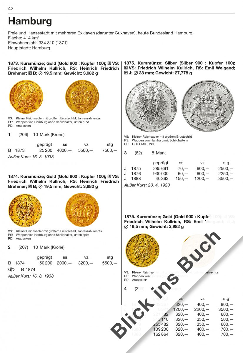 The tendency of the coin market to pay high prices for coins in above-average condition has continued. This is also reflected in the price quotations contained in this edition of the catalogue. The development of the gold price has also been taken into account regarding the gold coins. The section German-East-Africa emergency coins has been completely revised as new variations of the 5- and 20-heller coins and the 15-rupee gold coin have been discovered, which are bound to be of great interest to collectors.