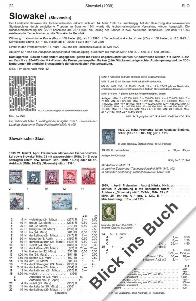 The reviewing and updating of price quotations was another focal point. In the collection area of Slovakia there have been many small price increases for so-called mass-produced issues, while first-day covers have enjoyed more significant increases in value. The demand for perforation variations of stamps issued by the Slovak State (1939-1945) seems to continue, as various price increases show. Many issue s from the Czech Republic – not only interesting motifs but also, more noticeably, stamp booklets – have also seen increases in value. In regards to issues from Czechoslovakia, we have primarily reviewed the price quotations for the years 1945-1960, and concerning Hungarian issues, we have updated the appraisals of tariff-coded stamps.