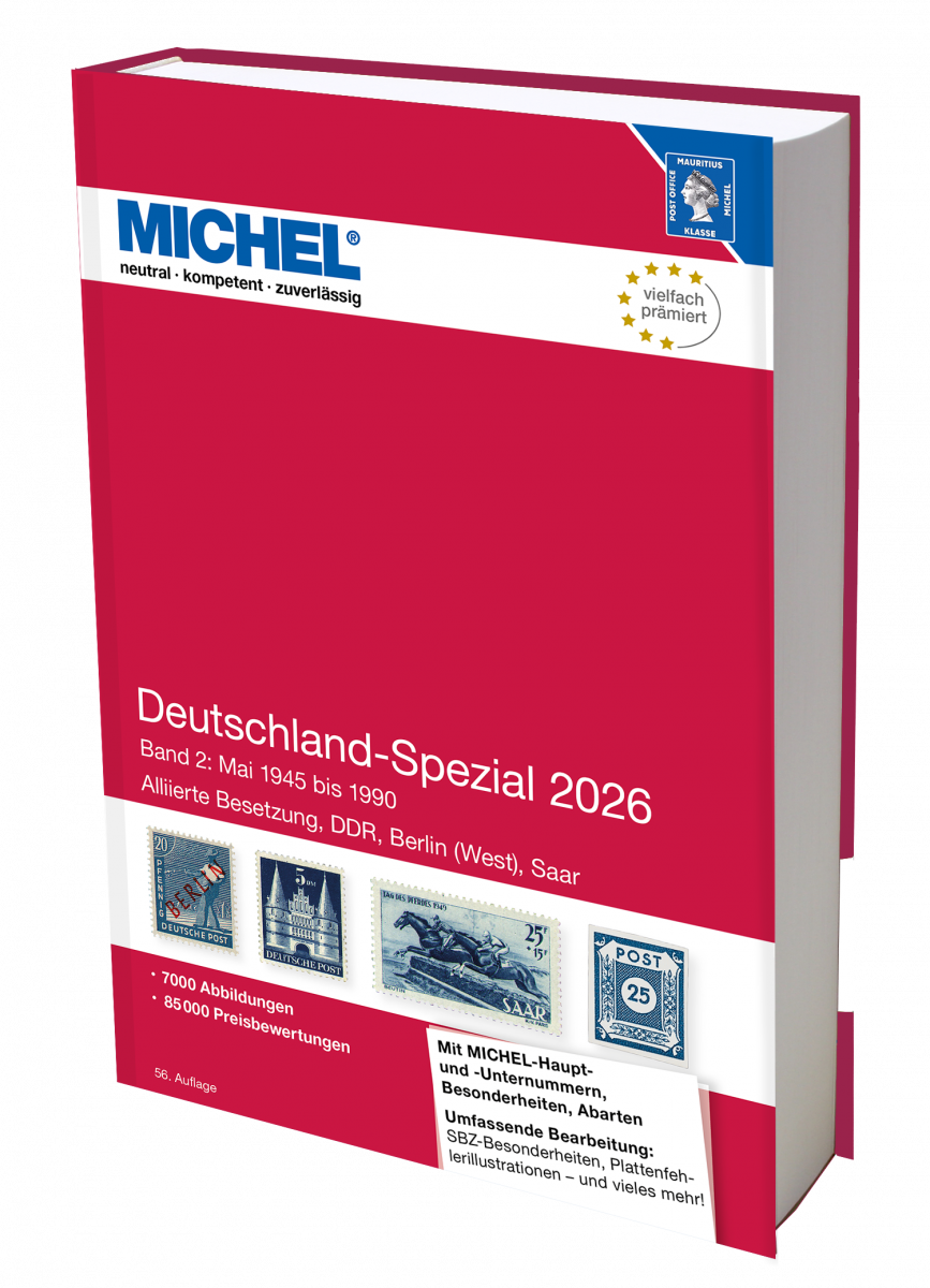 In the footsteps of the 90-year-old tradition of our Germany Special catalogues, this new edition of Volume 2, 2026, presents a dazzling array of newly recorded type variations and special features, be it paper webs that are glued together, attached blank spaces, multiple printings and partial perforations.