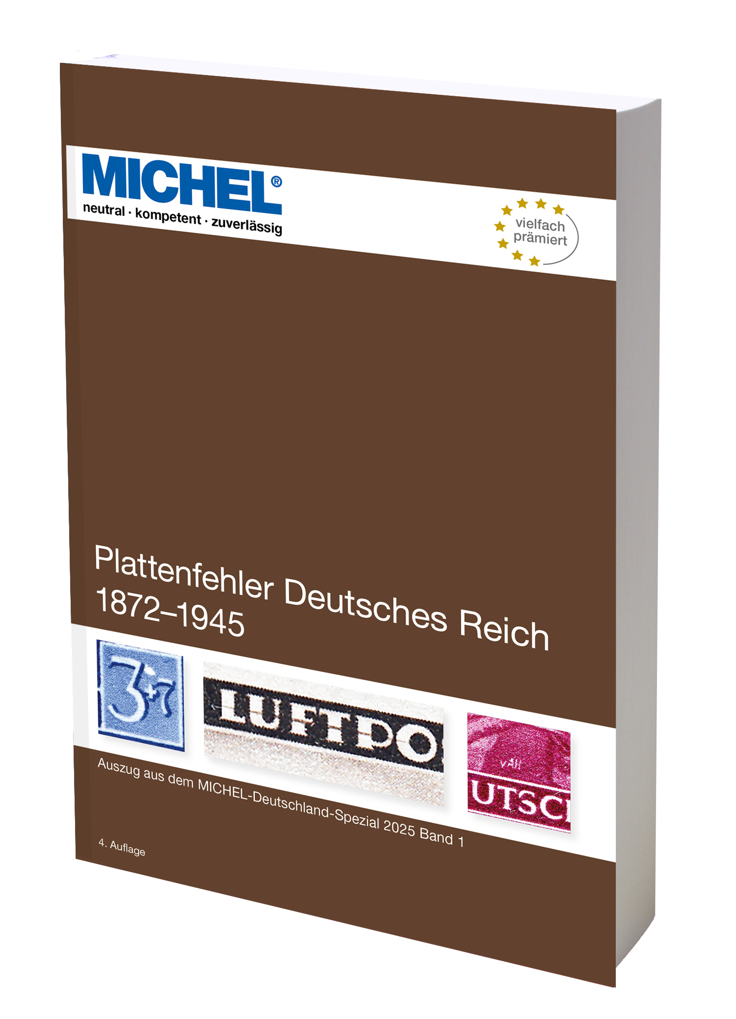 The MICHEL handbook “Plate Flaws of the German Reich 1872–1945”, an extract from the 2025 MICHEL Germany Special Volume 1, is a handy helper, providing a concise compilation of the fundamental stamp descriptions and the plate flaws known to date.